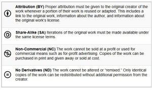 There are four main components of Creative Commons (CC) Licenses The symbols below represent these components and can be combined in a variety of ways to make a CC License.